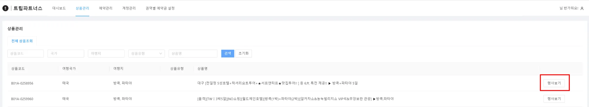 상품관리 - 전체 상품조회 : 여행사의 모든 상품을 조회할 수 있는 탭이에요.