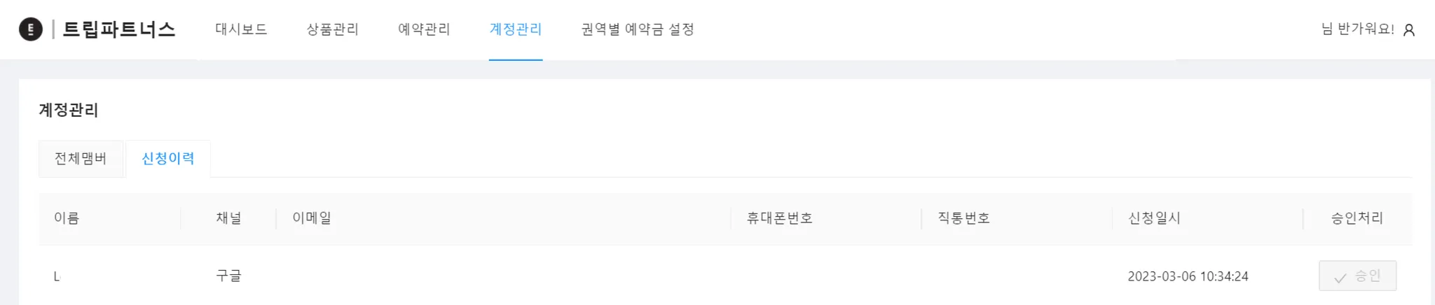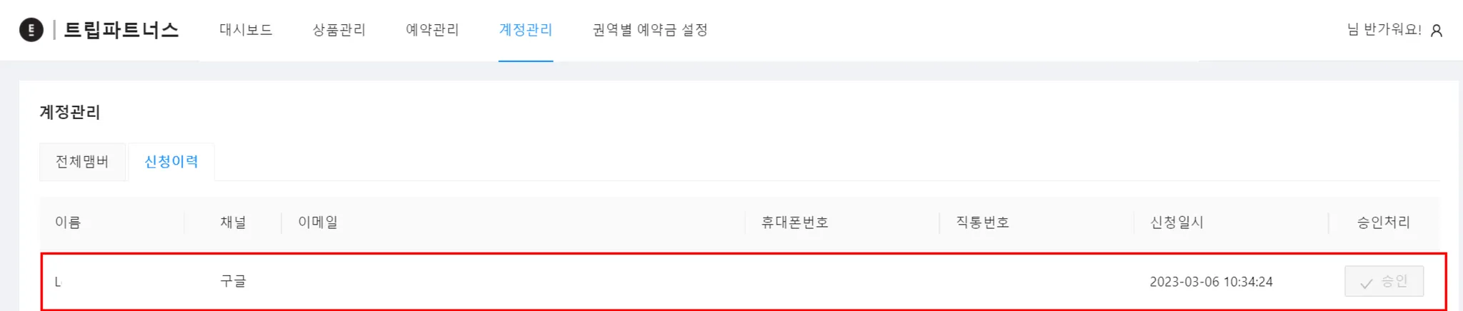 트립파트너스에 회원가입을 신청한 계정 확인이 가능해요.