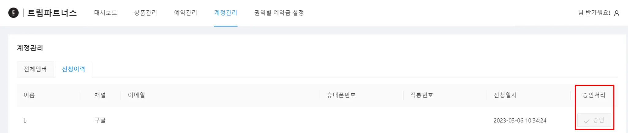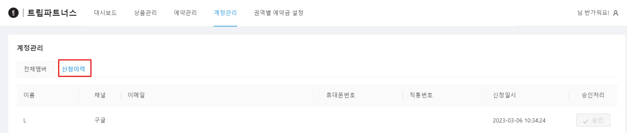 관리자 계정은 트립파트너스 계정관리 메뉴 내 신청이력 탭에서 승인 버튼을 눌러 다른 계정의 접근을 승인할 수 있어요.