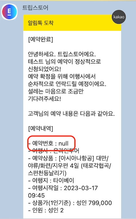 테스트 예약 진행한 경우, 전달 받은 알림톡에서 “예약번호: null”로 찍혀있는 것을 확인할 수 있습니다.