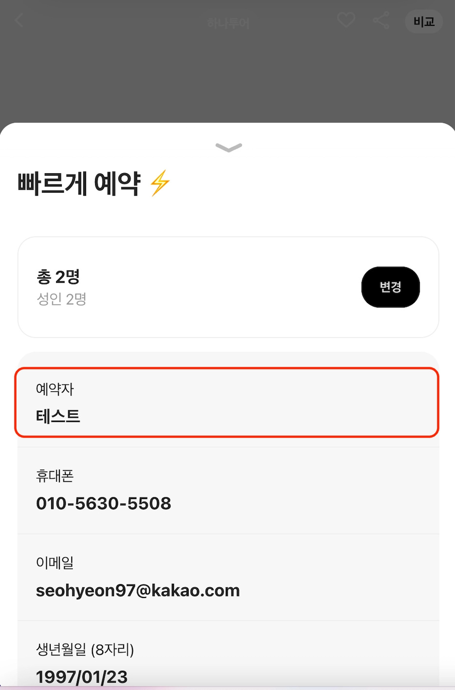 5. 예약 2단계 - 예약자명 “테스트”로 변경