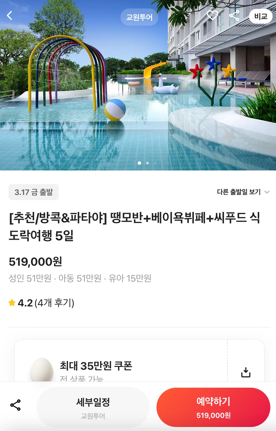 예약 테스트 진행할 여행 상품을 선택 후, 예약하기 버튼을 탭합니다.