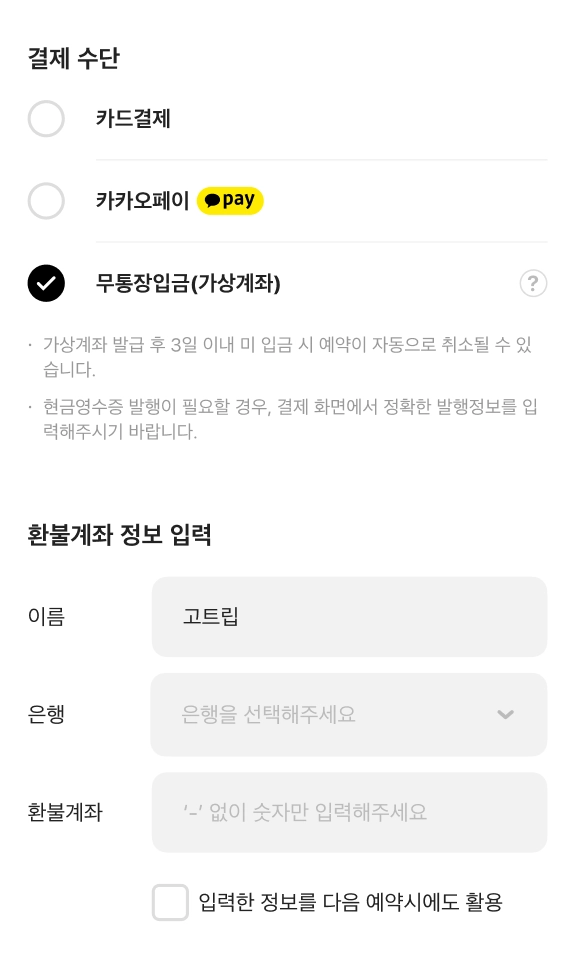 무통장입금(가상계좌)는 계좌 생성 후 3일(72시간) 동안 유효하며, 해당 기간내에 고객이 입금을 완료 하지 않으면 예약이 자동으로 취소요청 처리됩니다.